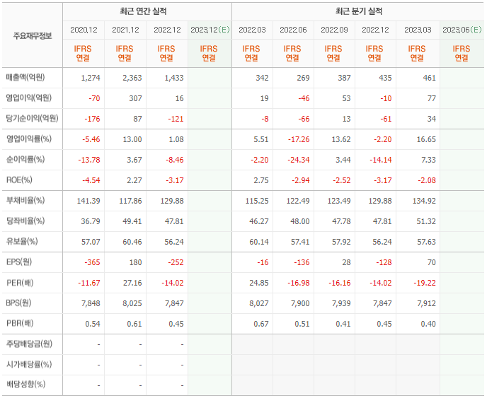 2022년 매출은 1433억, 영업이익은 16억, 당기순이익은 -121억입니다. 그리고 영업이익률은 1.08%입니다.