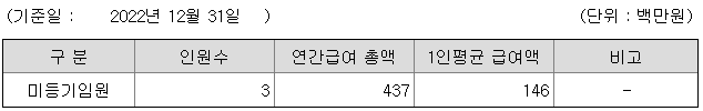 미등기임원의 평균연봉은 1억 4600만원이고 직원수는 3명입니다.