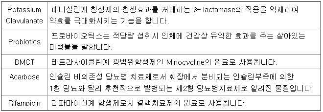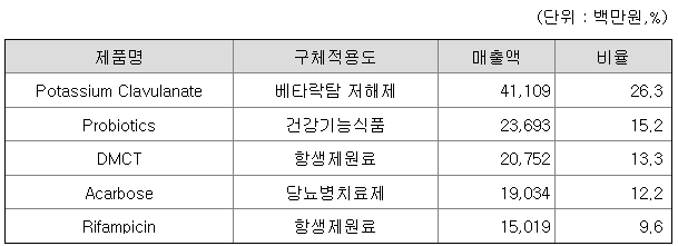 당사는 Potassium Clavulanate(베타락탐 저해제), Acarbose(당뇨병치료제), Rifampicin(항생제원료), DMCT(항생제원료), Probiotics(건강기능식품)등을 생산, 판매하고 있습니다. 보고서 제출일 현재 각 제품별 매출액 및 총매출액에서 차지하는 비율은 다음과 같습니다.
