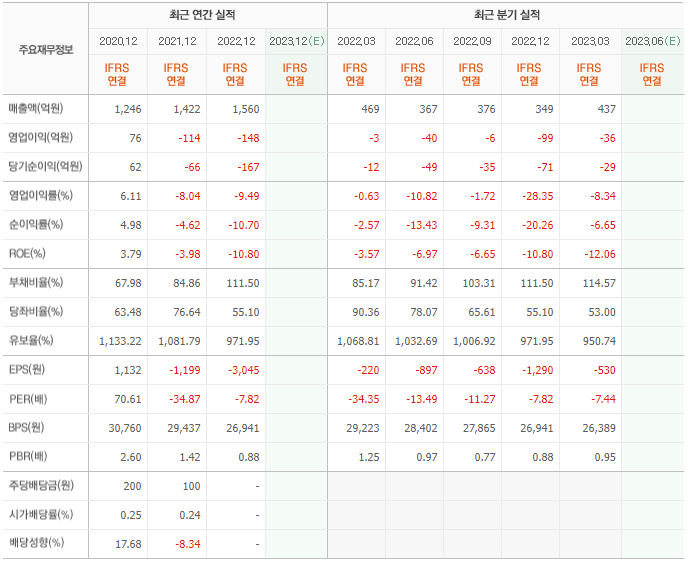 2022년 매출은 1560억, 영업이익은 -148억, 당기순이익은 -167억입니다. 그리고 영업이익률은 -9.49%입니다.