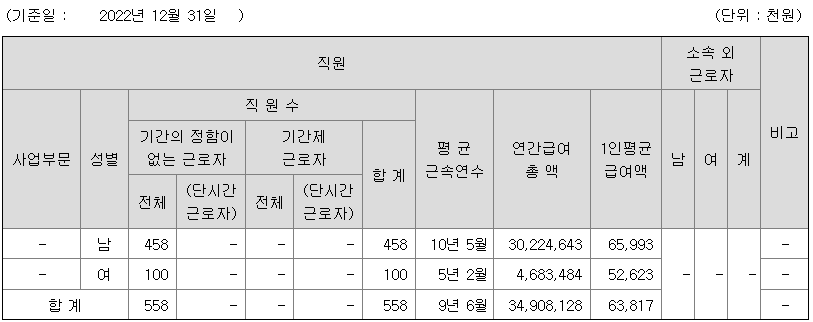 | 사업부문 | 성별 | 직원수 | 평균근속연수 | 평균연봉(백만) |