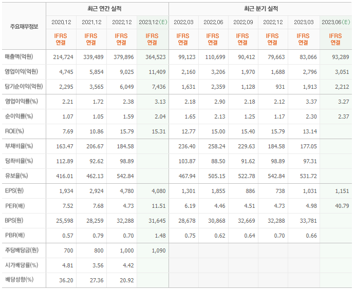 2022년 실적은 37조 9896억, 영업이익은 9025억입니다. 그리고 영업이익률은 2.38%입니다.