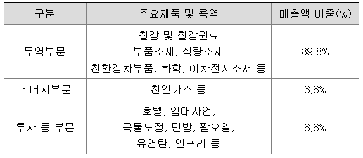 부문별 사업 성격 및 주요제품을 살펴보면, 무역부문은 철강 및 철강원료, 부품소재, 식량소재, 친환경차부품, 화학 등을 주요 품목으로 하여, 전세계에 분포되어 있는 해외 네트워크를 기반으로 트레이딩 연계 사업 및 다양한 분야로 사업을 확장해 가고 있습니다.