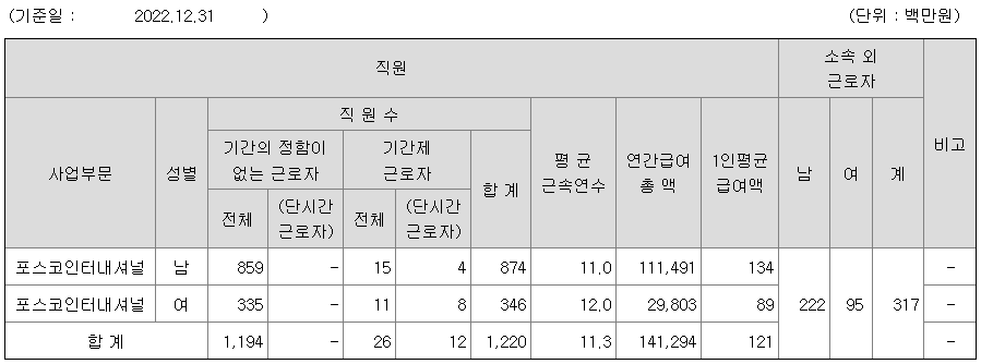 | 포스코인터내셔널 | 남 | 874 | 11.0 | 134 |