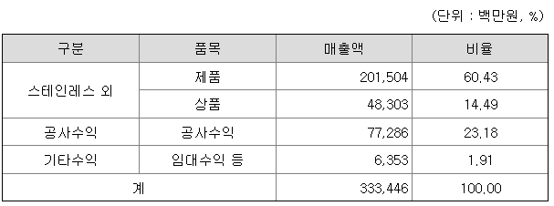 스테인리스 코일센터는 제강사로부터 스테인리스 코일을 공급받아 절단, 가공하여 판매하며 스테인리스 유통망의 중심 역할을 담당하고 있습니다. 현재 스테인레스1차가공을 하는 코일센터는20여개가 있으나, 당사와 경쟁하는 코일센타 중 당사의 주요제품인 열연 및 냉연 스테인레스 전 제품을 생산하는 곳은 많지 않습니다.