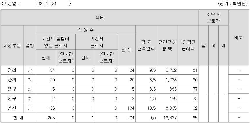 | 사업부문 | 성별 | 직원수 | 평균근속연수 | 평균연봉(백만) |