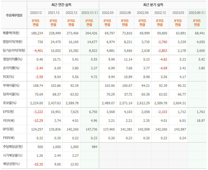 2022년 실적은 27조 3406억, 영업이익은 1조 6165억입니다. 그리고 영업이익률은 5.91%입니다.