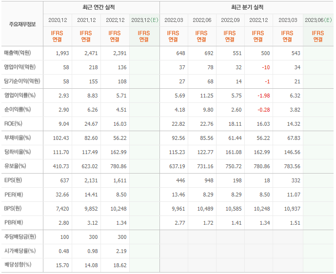 2022년 매출은 2391억, 영업이익은 136억, 당기순이익은 108억입니다. 그리고 영업이익률은 5.71%입니다.