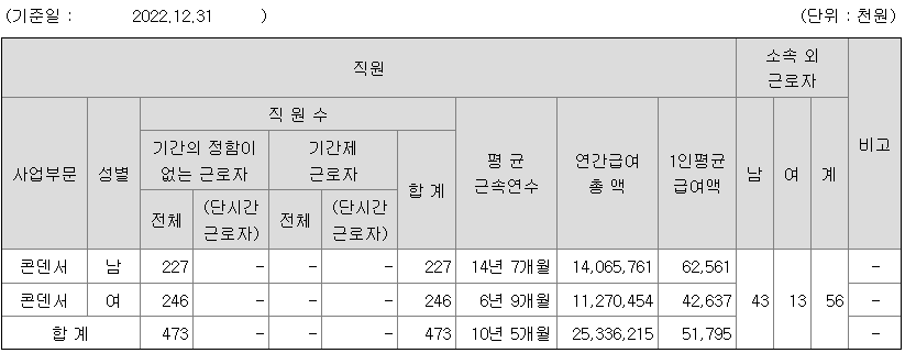 | 사업부문 | 성별 | 직원수 | 평균근속연수 | 평균연봉(백만) |