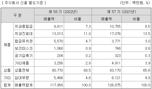 당사의 주요제품으로는 치과용 합금, 치과용 진료대, 치과용 X선 촬영기, 공기 압축기 등이 있으며, 구분별로는 치과에서 사용하는 소모성 재료 등의 상품이 매출 중 가장 큰 비중을 차지하고 있습니다. 각 부분이 당기 매출액에서 차지하는 비중은 아래 표와 같습니다.