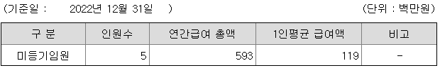 미등기임원의 평균연봉은 1억 1900만원이고 직원수는 5명입니다.