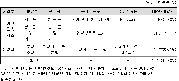 당사는 반도체, 전기, 전자부품, 자동차, 선박, 산업용 기계류 등 첨단 기초소재로써 활용되는 황동봉 제품을 주력으로 판매하고 있으며, 일부 상품 및 기타 품목을 매출하고 있습니다. 당기말 기준 지배회사 및 종속회사의 별도재무제표상 제품별 매출액과 총 매출액에서 차지하는 비율은 다음과 같습니다.