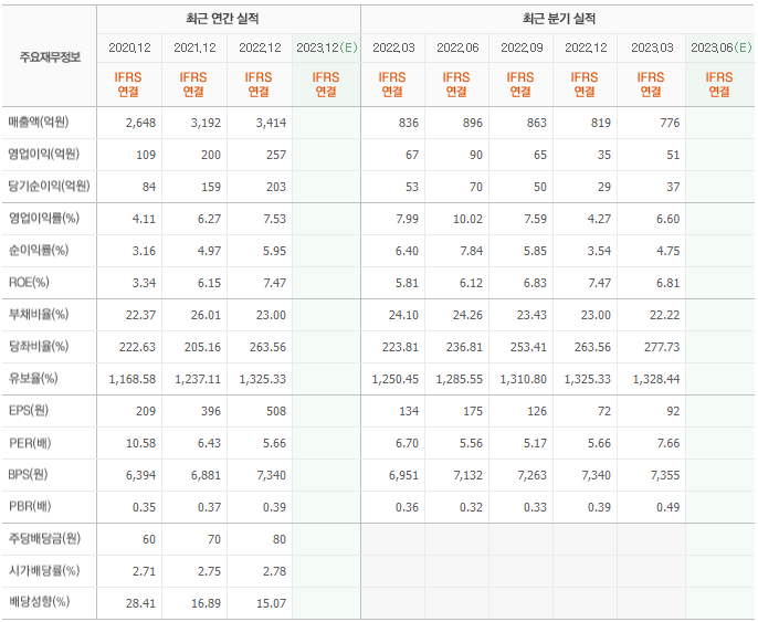 2022년 매출은 3414억, 영업이익은 257억, 당기순이익은 203억입니다. 그리고 영업이익률은 7.53%입니다.
