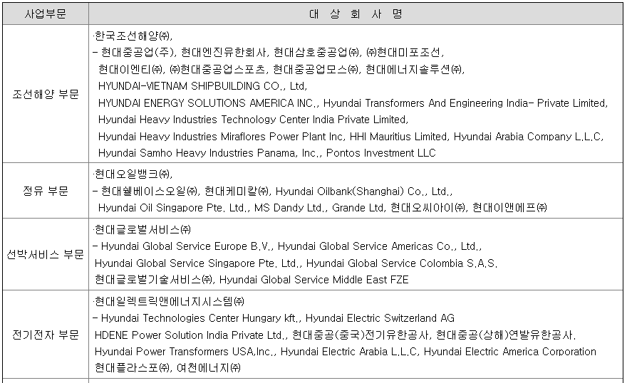 당사의 영업수익(별도 재무제표 기준)은 자회사 등으로부터의 배당수익, 상표권 사용수익, 임대수익 등으로 구성되어 있으며, 조선사업, 해양플랜트사업, 엔진기계사업, 그린에너지사업 및 선박ㆍ엔진의 A/S사업, 정유사업, 건설기계 제조사업, 전기전자기기 제조사업, 산업용 로봇 제조업 등을 영위하는 자회사의 주식을 소유하고 있습니다.