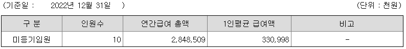 미등기임원의 평균연봉은 3억 3000만원이고 직원수는 10명입니다.