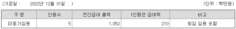 미등기임원의 평균연봉은 2억 1000만원이고 직원수는 5명입니다.