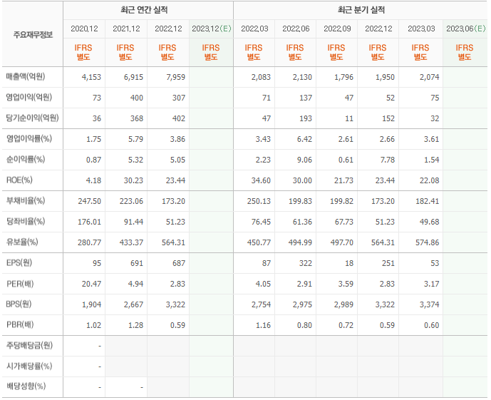 2022년 매출은 7959억, 영업이익은 307억, 당기순이익은 402억입니다. 그리고 영업이익률은 3.86%입니다.
