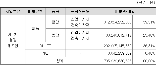 회사의 매출액은 전년 동기 대비 1,044억원이 증가한 7,959억원이며 봉형강매출이 4,991억원(62.7%), BILLET 매출이 2,930억원(36.8%), 기타매출이 38억원(0.5%)을 차지하고 있습니다.