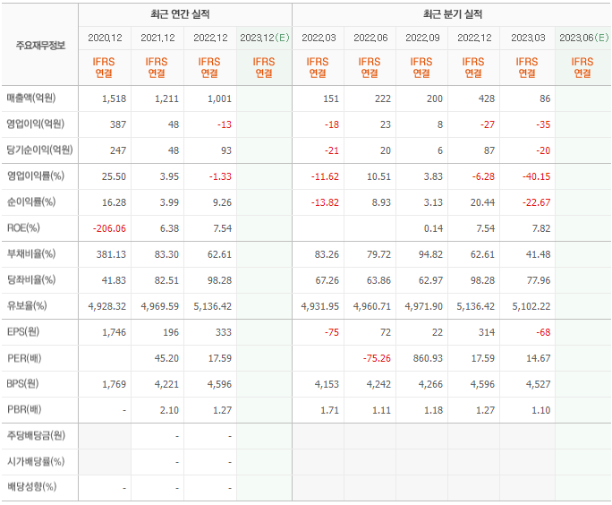 2022년 매출은 1001억, 영업이익은 -13억, 당기순이익은 93억입니다. 그리고 영업이익률은 -1.33%입니다.