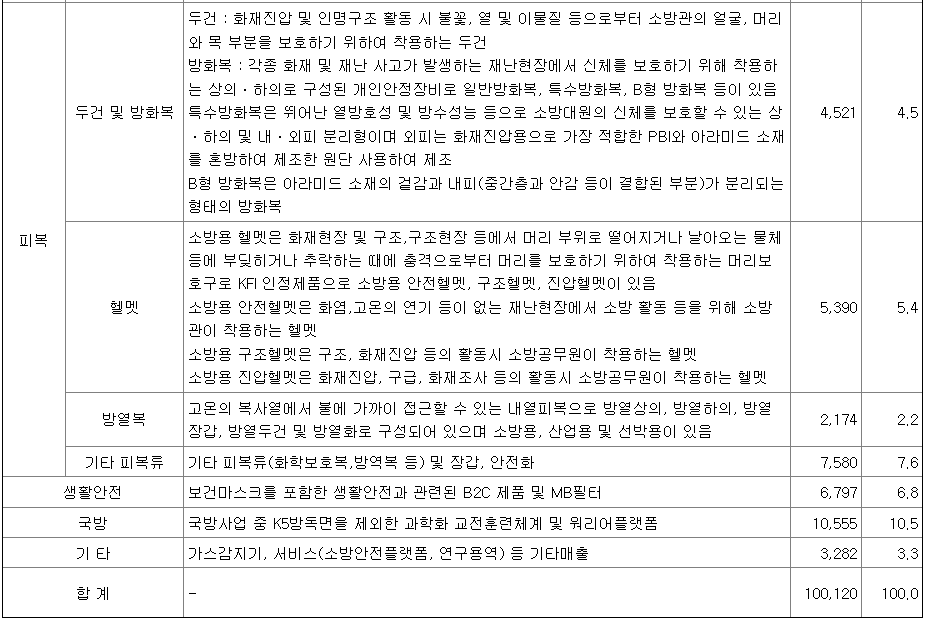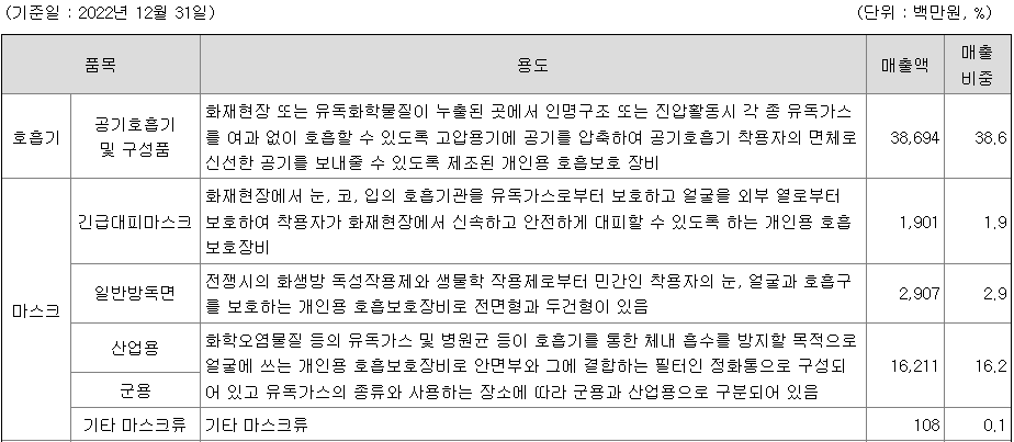 당사가 영위하는 산업은 개인안전장비(Personal Protective Equipment) 영역에 속하며, 특히 유독가스가 노출된 현장 및 산소가 부족한 밀폐된 공간 등의 작업환경 또는 화재현장과 같은 재난 극한 상황에서 작업자의 생명을 보호하는 목적으로 호흡기, 피복류, 헬멧, 장화, 장갑 등 개인용 안전장비를 생산 및 판매하고 있습니다.
