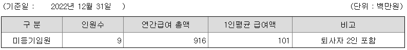 미등기임원의 평균연봉은 1억 100만원이고 직원수는 9명입니다.