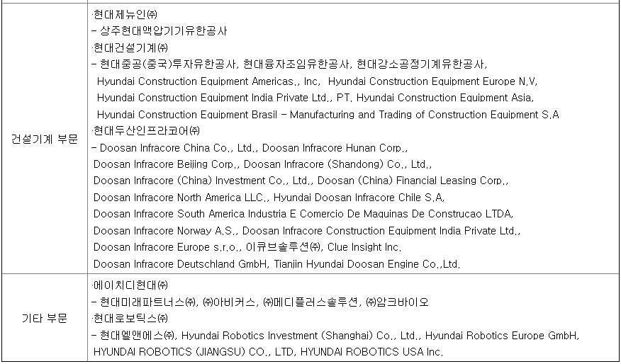 당사의 영업수익(별도 재무제표 기준)은 자회사 등으로부터의 배당수익, 상표권 사용수익, 임대수익 등으로 구성되어 있으며, 조선사업, 해양플랜트사업, 엔진기계사업, 그린에너지사업 및 선박ㆍ엔진의 A/S사업, 정유사업, 건설기계 제조사업, 전기전자기기 제조사업, 산업용 로봇 제조업 등을 영위하는 자회사의 주식을 소유하고 있습니다.