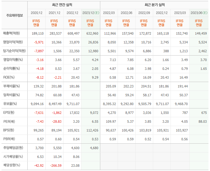 2022년 실적은 60조 8497억, 영업이익은 3조 3870억입니다. 그리고 영업이익률은 5.57%입니다.