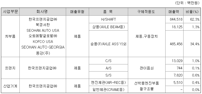 -당사는 자동차에 사용되는 차부품제품, 프랜지제품 및 산업기계제품 등을 생산, 판매하고 있으며, 당사 및 종속회사의 각 제품별 매출액 및 매출액에서 차지하는 비율은 아래와 같습니다.