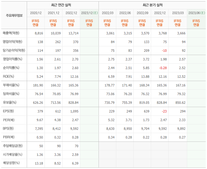 2022년 매출은 1조 3714억, 영업이익은 370억, 당기순이익은 356억입니다. 그리고 영업이익률은 2.70%입니다.