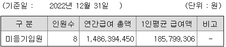 미등기임원의 평균연봉은 1억 8500만원이고 직원수는 8명입니다.