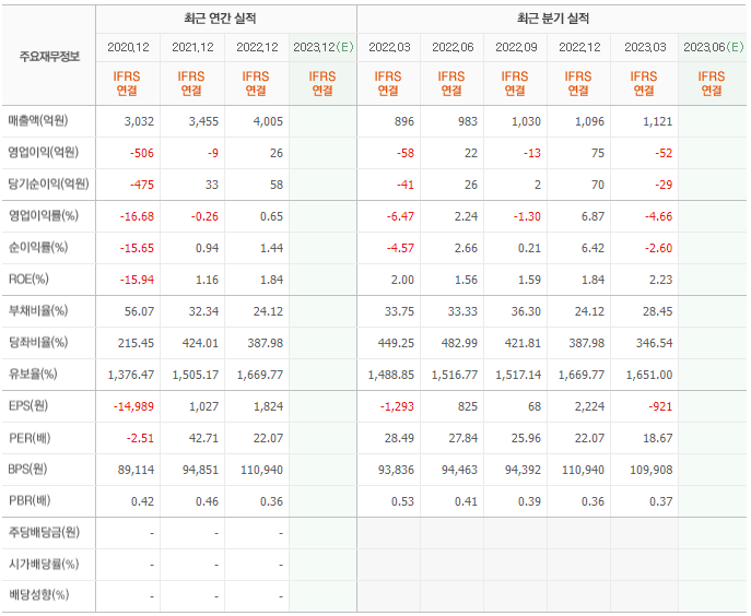 2022년 매출은 4005억, 영업이익은 26억, 당기순이익은 58억입니다. 그리고 영업이익률은 0.65%입니다.
