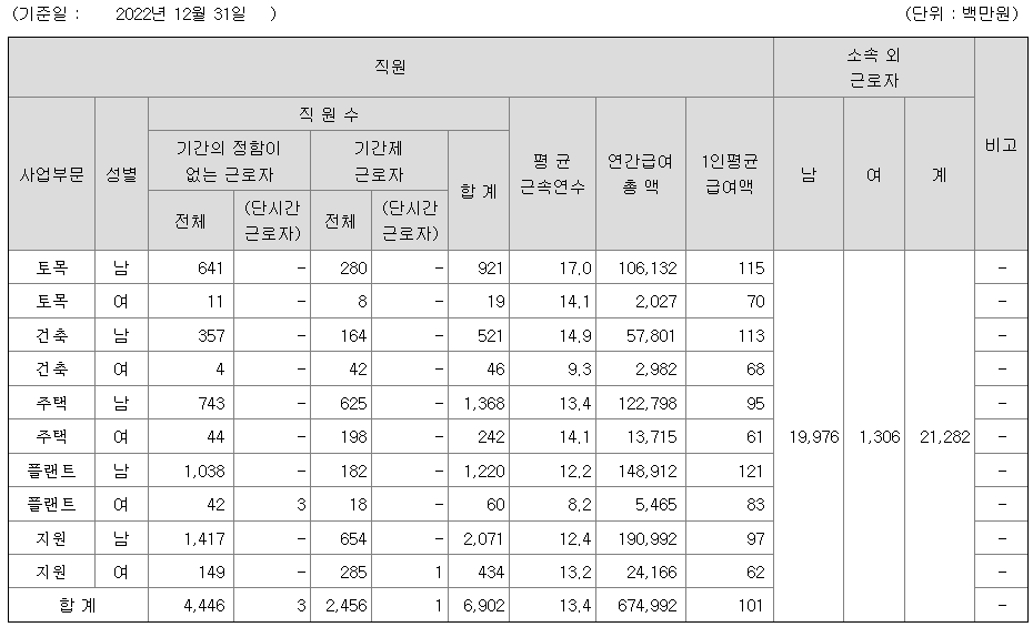 | 사업부문 | 성별 | 직원수 | 평균근속연수 | 평균연봉(백만) |