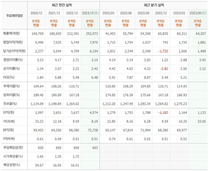 2022년 실적은 21조 2391억, 영업이익은 5749억입니다. 그리고 영업이익률은 2.71%입니다.