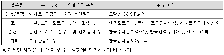 건축사업 분야는 주거, 의료, 사무, 교육, 체육, 문화시설에서 첨단산업 및 공공기관시설까지 광범위한 종류의 건축물을 담당하고 있으며, 재개발ㆍ재건축, 아파트, 주상복합 사업 등의 주택사업을 포함합니다. 건축사업은 기술 및 트렌드의 변화에 민감하게 반응하는 특성을 가지고 있으며, 주택사업은 경기동향 및 고객의 니즈에 민감한 특성을 가지고 있습니다.