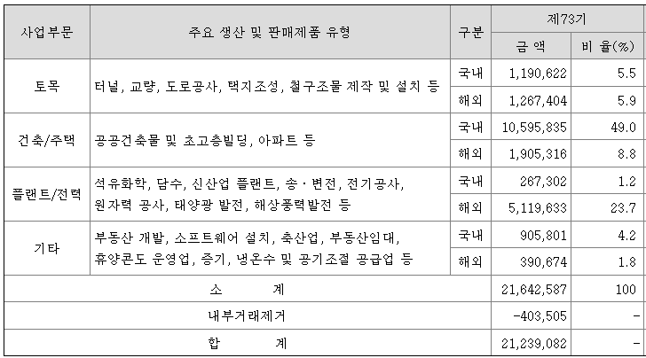 현대건설주식회사와 그 종속회사(이하 연결실체)의 연결부문인 사업본부는 서로 다른 사업과 용역을 제공하는 전략적 사업단위입니다. 각 사업은 서로 다른 공사기술과용역 등을 요구하고 있기 때문에 별도로 운영되고 있으며, 각 사업부문별 제품 및 매출실적 등은 다음과 같습니다.