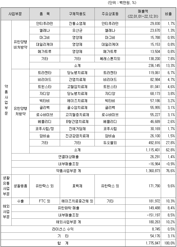 당사는 의약품, 화학약품, 공업약품, 수의약품, 생활용품 등의 제조 및 매매를 주 사업목적으로 하고 있으며, 주요 제품으로는 렉라자, 안티푸라민, 삐콤씨, 듀오웰, 코푸시럽 등이 있습니다.