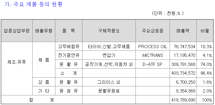 당사의 주요제품은 전기절연유 , 고무배합유, 윤활유등 산업용 윤활유가 주종을 이루며 제품의 고급화 및 특수유 생산에 주력하며 꾸준히 성장을 하여 수익을 창출하고 있습니다.