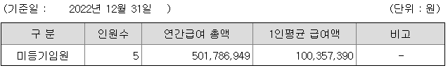 미등기임원의 평균연봉은 1억원이고 직원수는 5명입니다.