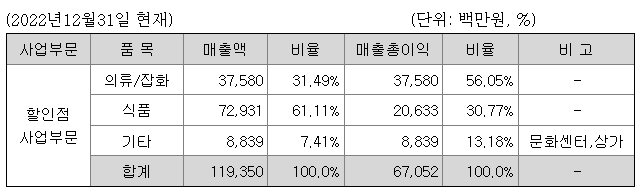 회사는 의류, 생활용품, 식품등을 직접구매 하거나 브랜드를 입점시켜 소비자에게 판매하는 백화점형 할인점을 운영하고 있으며, 각 제품별 매출액 및 매출총이익에서 차지하는 비율은 다음과 같습니다.