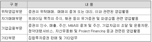 위탁영업 부문은 유가증권의 증권의 위탁매매, 매매의 중개 또는 대리, 이와 관련된 영업활동을 하고 있고, 자기매매 부문은 트레이딩 목적의 주식, 채권 등의 유가증권 및 파생상품 관련 영업활동 하고 있으며, 기업금융 부문은 증권의 인수, 매출, 주선, M&A의 중개 및 주선, 기업자금의 조달 및 운용자문, 청약대행서비스, 자산유동화 및 Project Financing 등과 관련된 영업활동을 하고 있습니다. 마지막으로 기타 부문은 집합투자증권 판매 및 기타업무로 구성되어 있습니다.