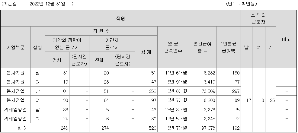 전체 평균연봉은 1억 9200만원이고 직원수는 520명입니다.