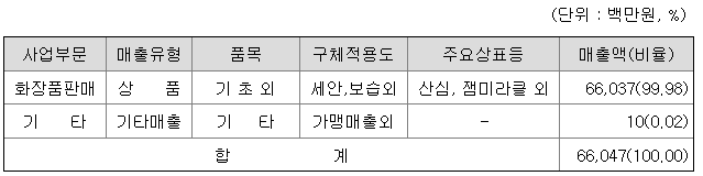 당사는 주식회사한국화장품제조(구: 한국화장품주식회사)의 화장품판매 및 부동산임대 사업부문이 인적분할되어 2010년 5월에 설립되었으며, 기초화장품과 색조화장품을 비롯 700여 종류의 화장품판매를 영위하는 종합 화장품회사입니다. 주요 유통경로는 시판사업부(인터넷, 홈쇼핑, 총판), H&B사업부(방문판매) 등이며, 자회사인 더샘인터내셔날을 통해 브랜드숍 관련 화장품 판매사업을 영위하고 있으며, 2020년 힐리브를 설립하여 온라인 판매사업을 영위하고 있습니다.