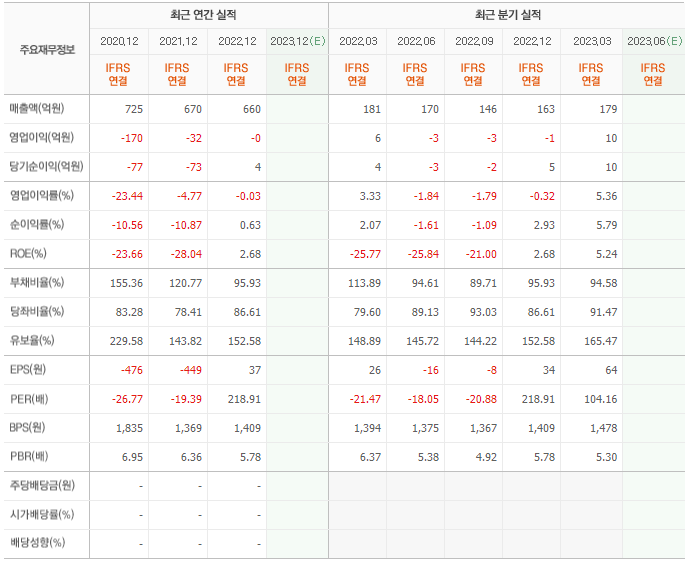 2022년 매출은 660억, 영업이익은 -0억, 당기순이익은 4억입니다. 그리고 영업이익률은 -0.03%입니다.