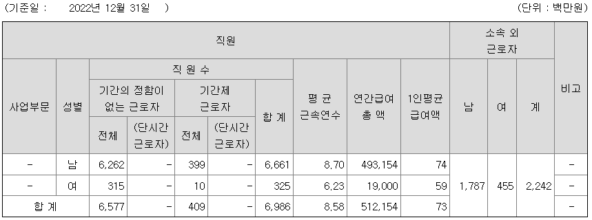 | 사업부문 | 성별 | 직원수 | 평균근속연수 | 평균연봉(백만) |