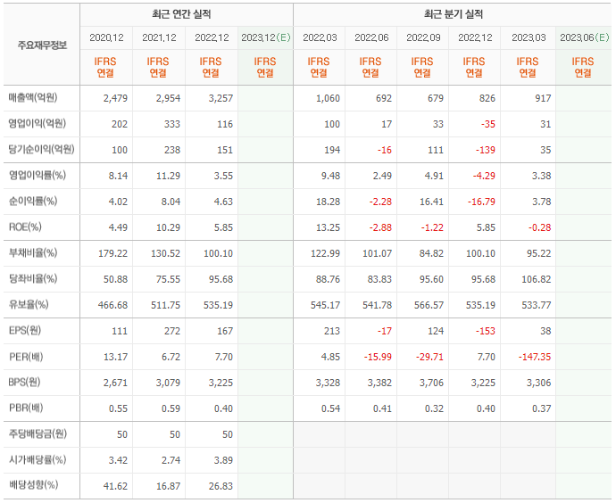 2022년 매출은 3257억, 영업이익은 116억, 당기순이익은 151억입니다. 그리고 영업이익률은 3.55%입니다.