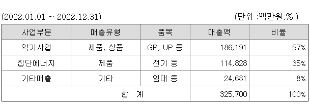 당사는 악기 사업, 집단 에너지 사업 2개 사업부문으로 구성되어 있습니다.