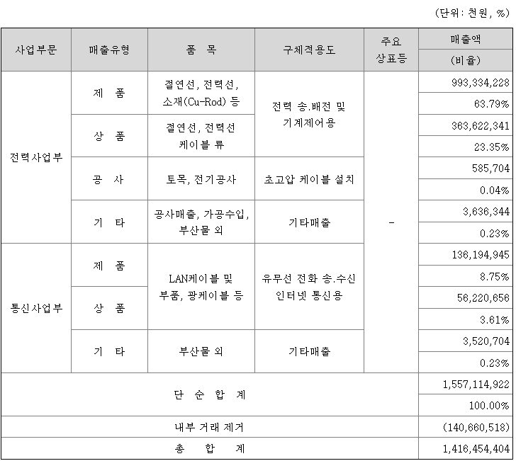 연결기업은 전력케이블 및 통신케이블 등을 생산하는 국내 3대 전선 전문 제조업체로서 고객 중심 영업 활동을 적극 전개하여 내수 및 수출시장 확대에 노력하고 있으며, 특히 최근에는 동남아, 북미 지역 투자를 결정하여 해외시장 개척에도 적극적으로 나서고 있습니다.