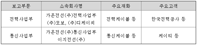 연결기업은 제공하는 재화나 용역에 근거하여 전력케이블의 생산ㆍ판매하는 전력사업부와 통신케이블을 생산ㆍ판매하는 통신사업부로 구분하고 있습니다.