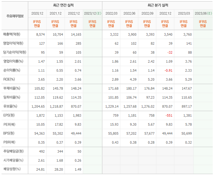 2022년 매출은 1조 4165억, 영업이익은 285억, 당기순이익은 105억입니다. 그리고 영업이익률은 2.01%입니다.