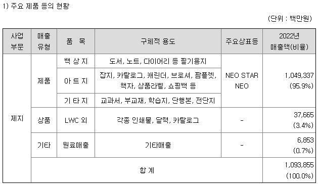 ① 제지부문 : 아트지, 백상지 등 인쇄용지 제조 및 판매